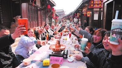 潼川古城長(zhǎng)桌宴吃出歡樂(lè)年味。記者 李春梅 攝