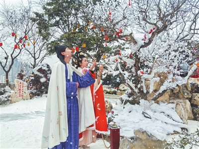 游客身著漢服在龜山上賞“雪”。 記者 唐顯枚 攝