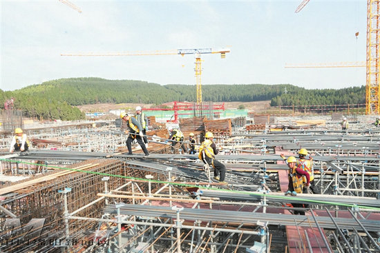 綿陽(yáng)新型顯示產(chǎn)業(yè)園基礎(chǔ)設(shè)施建設(shè)項(xiàng)目現(xiàn)場(chǎng),工人正進(jìn)行廠房主體結(jié)構(gòu)施工。記者 尹秦 攝