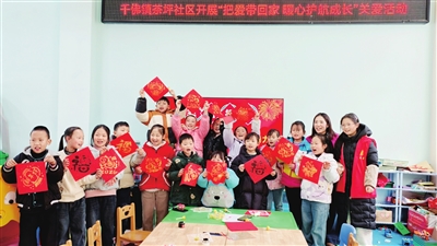 茶坪社區(qū)兒童之家,張春紅(右二)帶孩子們寫春聯(lián)做剪紙。記者 楊方彧 攝