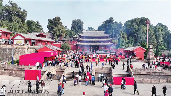 游客穿梭在蒼勁古柏與古樸殿宇之間,或駐足焚香,祈愿新一年平安順?biāo)?;或輕撫紅繩,期盼新一年學(xué)業(yè)進(jìn)步、事業(yè)高升;更有千年傳承的洞經(jīng)古樂,讓心靈在古音中沉靜。