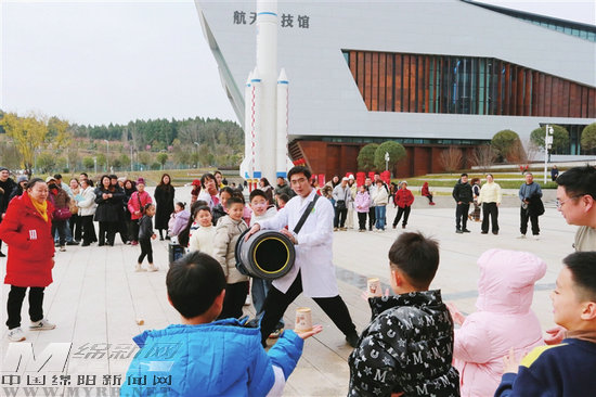 另一邊的航天科技館外,科普實驗秀妙趣橫生,在動手實踐中解鎖科學(xué)密碼,讓孩子的好奇心與求知欲一起飛揚。只見工作人員熟練操作實驗器材,液氮玫瑰一拍即碎、火焰在掌心安全跳躍、氣體瞬間膨脹的奇妙現(xiàn)象,引得游客們紛紛駐足圍觀,大人小孩目不轉(zhuǎn)睛地緊盯實驗過程,現(xiàn)場不時響起陣陣驚呼與贊嘆,年味與科技感在這里交融。