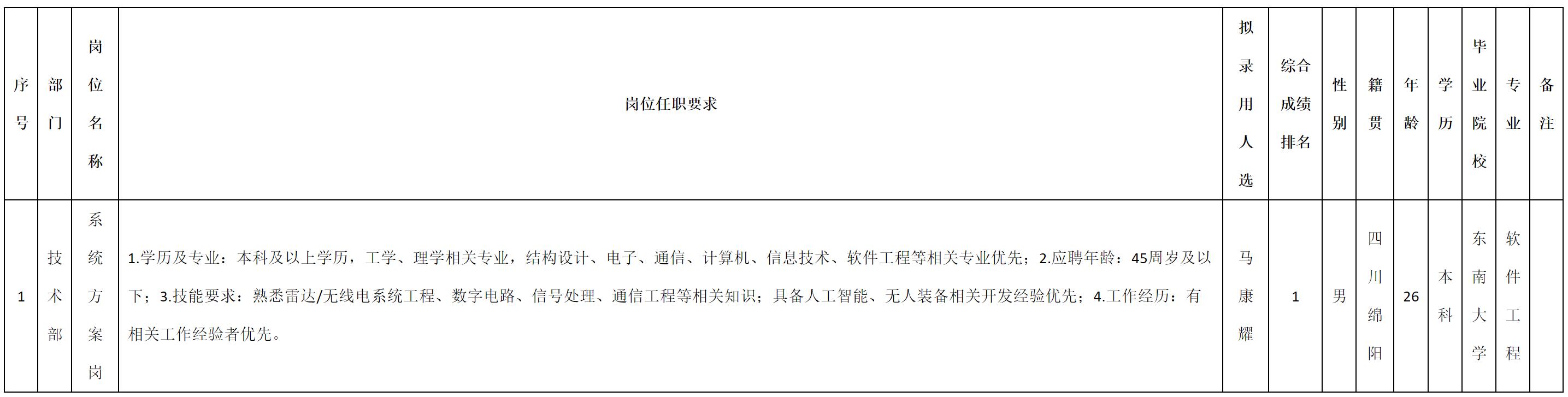根據(jù)九洲集團(tuán)成都創(chuàng)智融合科技有限公司發(fā)布的招聘公告及招聘相關(guān)規(guī)定,經(jīng)測試、考察、體檢等程序,擬錄用馬康耀同志到九洲集團(tuán)成都創(chuàng)智融合科技有限公司工作,現(xiàn)予以公示,具體情況如下: