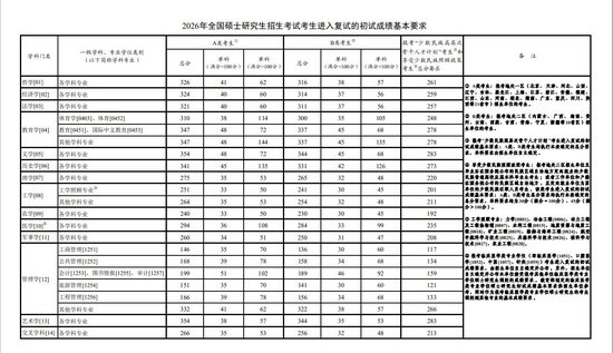 2月28日,教育部發(fā)布《2026年全國(guó)碩士研究生招生考試考生進(jìn)入復(fù)試的初試成績(jī)基本要求》(國(guó)家分?jǐn)?shù)線)。各招生單位根據(jù)《2026年全國(guó)碩士研究生招生工作管理規(guī)定》,在國(guó)家分?jǐn)?shù)線的基礎(chǔ)上,自主確定并公布報(bào)考本單位的考生進(jìn)入復(fù)試的初試成績(jī)要求及其他學(xué)術(shù)要求。