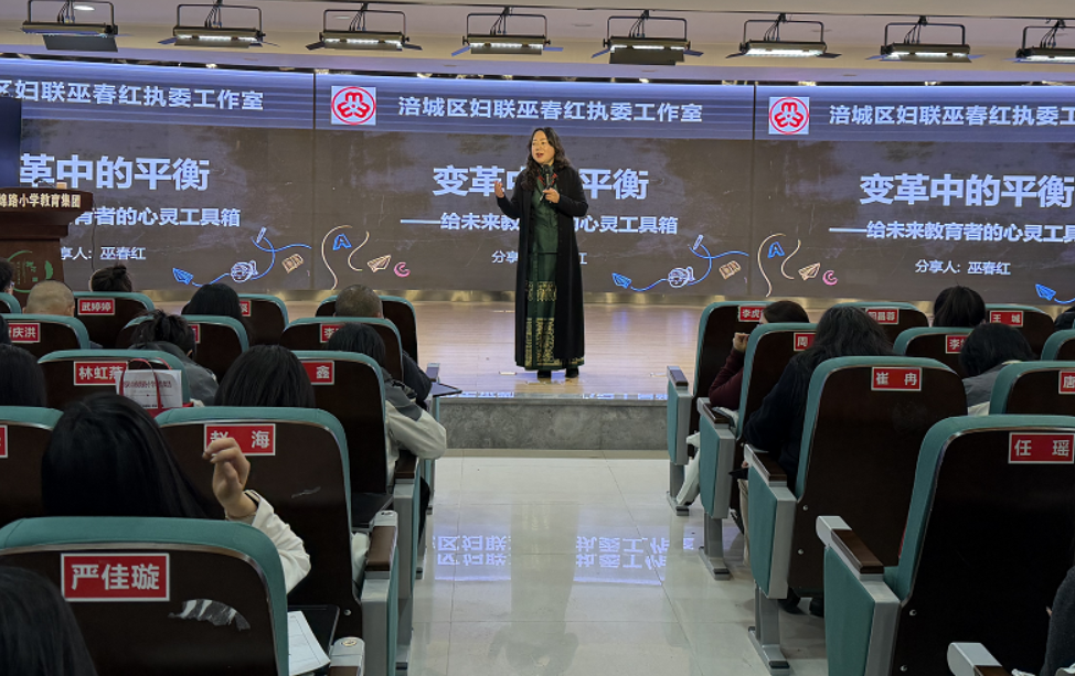 培訓(xùn)特邀國家二級心理咨詢師、涪城區(qū)婦聯(lián)兼職副主席巫春紅老師主講,她以《變革中的平衡-給教育工作者的心靈工具箱》為主題,緊扣AI時代教育變革趨勢,從教育底層邏輯重構(gòu)、教師角色多元轉(zhuǎn)型、心理賦能實(shí)操方法三大維度展開分享。巫老師結(jié)合《2023教師職業(yè)狀態(tài)報告》,剖析了教育技術(shù)迭代下教師的適應(yīng)壓力與職業(yè)現(xiàn)狀,明確新時代教師需從“育分”轉(zhuǎn)向“育人”,承擔(dān)知識傳授者、學(xué)生成長導(dǎo)師、教育創(chuàng)新實(shí)踐者的多重角色。圍繞壓力管理、情緒平衡與職業(yè)幸福感提升,她帶來認(rèn)知重構(gòu)、微觀賦能、個人行動規(guī)劃三大“心靈工具箱”,講解3分鐘呼吸法、記錄教育小確幸、15分鐘正念練習(xí)等實(shí)用技巧,引導(dǎo)教師找準(zhǔn)身心平衡支點(diǎn),以積極心態(tài)應(yīng)對教育變革挑戰(zhàn)。