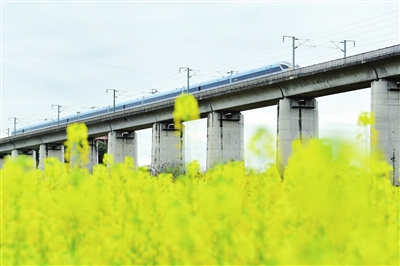 3月1日,涪江岸邊,一列動(dòng)車駛過(guò)油菜花田,勾勒出一幅動(dòng)靜相宜的春日畫卷。 記者 王勇 攝