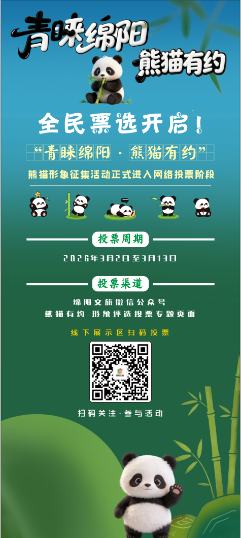 本次網(wǎng)絡(luò)投票周期為2026年3月2日至3月13日,廣大市民、網(wǎng)友可通過(guò)“綿陽(yáng)文旅”微信公眾號(hào)進(jìn)入投票專題頁(yè)面,為心儀的熊貓IP形象投票,也可在5個(gè)線下展示區(qū)掃碼參與投票。