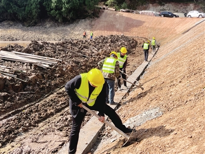 鵝溪鎮(zhèn)長(zhǎng)壽村山坪塘整治現(xiàn)場(chǎng),工人們正在砌筑護(hù)坡?!∪~亮亮 攝