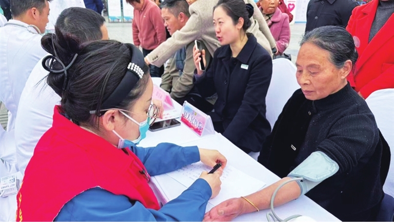 醫(yī)護(hù)志愿者為老年群眾免費(fèi)測(cè)量血壓。