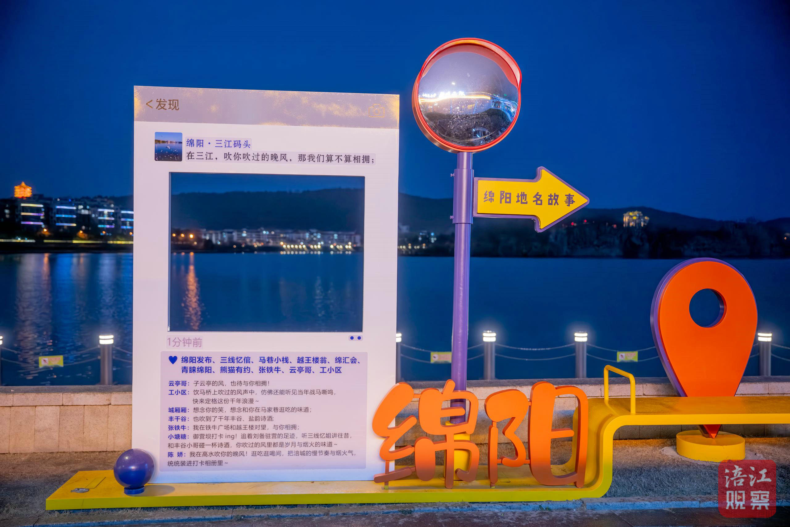 2025年,涪城區(qū)將地名文化引入“越王樓-三江湖”4A級景區(qū)。三江碼頭全新亮相的字幕城市畫框打卡點(diǎn),循環(huán)展示核心地名介紹;特色彩繪墻與打卡裝置,讓地名故事化作江畔風(fēng)景。