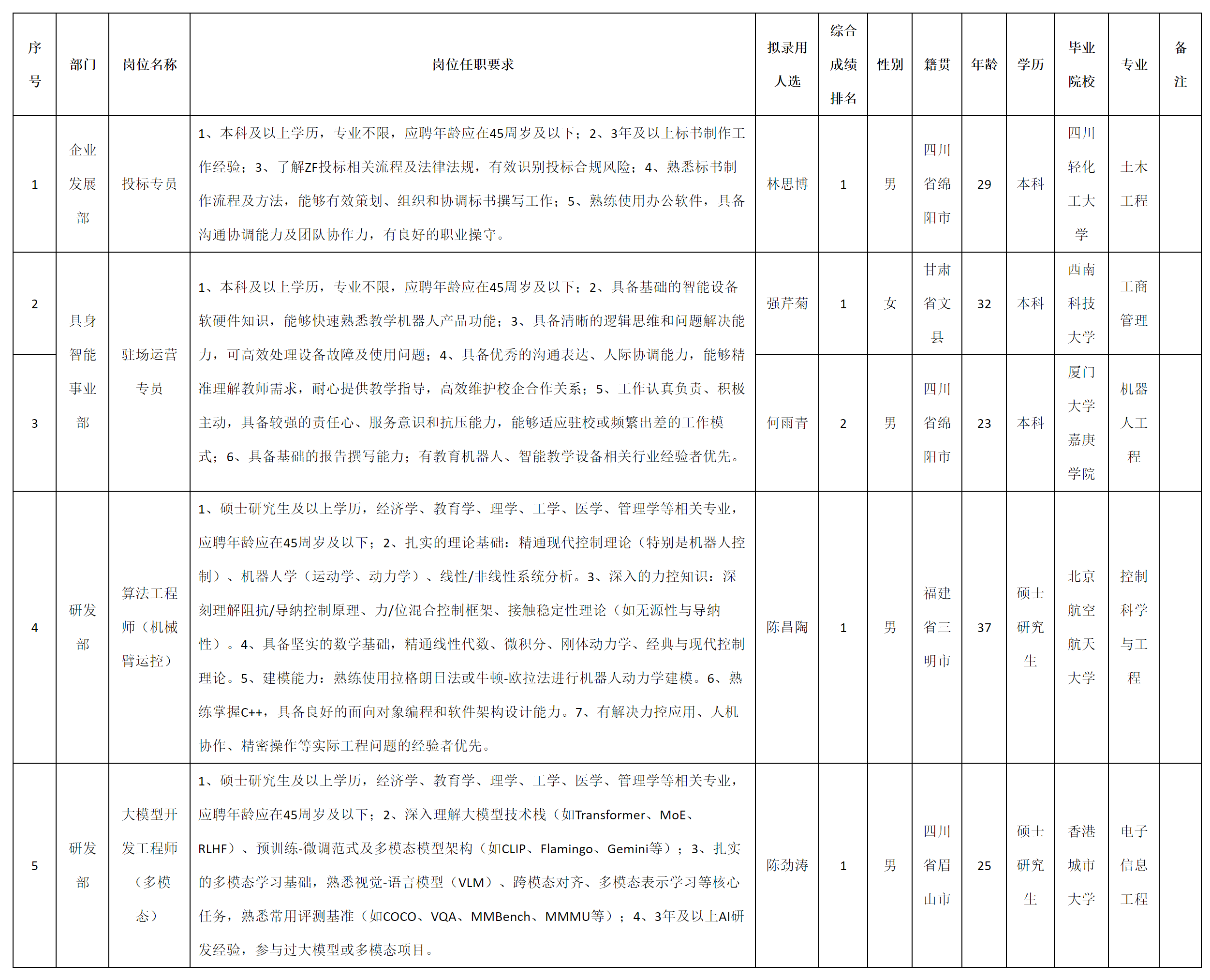 根據(jù)四川九洲投資控股集團(tuán)有限公司軟件與數(shù)據(jù)智能產(chǎn)業(yè)發(fā)布的招聘公告及招聘相關(guān)規(guī)定,經(jīng)測試、考察、體檢等程序,擬錄用林思博等5名同志到四川九洲投資控股集團(tuán)有限公司軟件與數(shù)據(jù)智能產(chǎn)業(yè)工作,現(xiàn)予以公示,具體情況如下:
