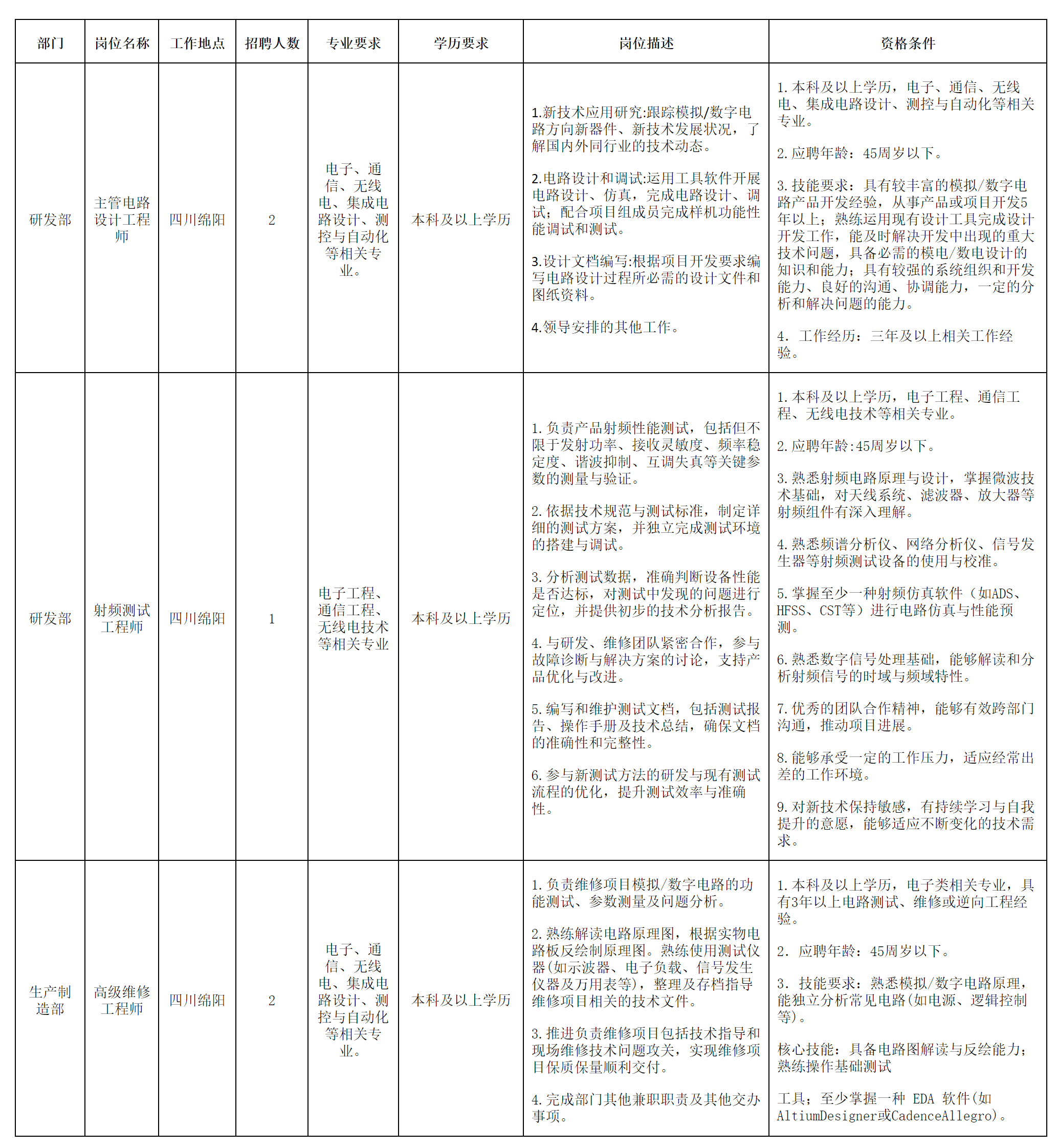 四川長虹電子科技有限公司(國營第七八〇廠)始建于1958年,是國家“一五”期間的156個重點(diǎn)項(xiàng)目之一,是我國第一個機(jī)載火控雷達(dá)科研生產(chǎn)基地,位于綿陽市經(jīng)濟(jì)技術(shù)開發(fā)區(qū)。公司注冊資本1.7億元人民幣,為國有獨(dú)資企業(yè)。公司以高端光電儀器和高端光電裝備為主線,主要從事重力測量、光電探測和光電告警領(lǐng)域產(chǎn)品研發(fā)和生產(chǎn)。因業(yè)務(wù)發(fā)展需要,現(xiàn)誠聘英才,招聘崗位及要求如下: