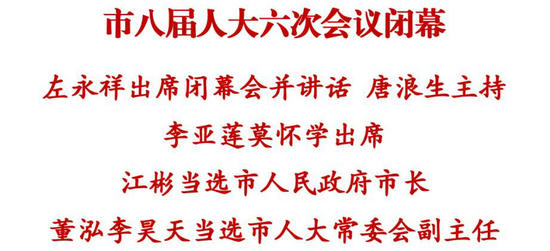 根據(jù)本次大會選舉辦法和有關(guān)規(guī)定,會議通過無記名投票方式,選舉江彬為綿陽市人民政府市長;選舉董泓、李昊天為綿陽市第八屆人民代表大會常務(wù)委員會副主任;選舉江保權(quán)、李果、羅毅、趙倩穎、黃慶為綿陽市第八屆人民代表大會常務(wù)委員會委員。