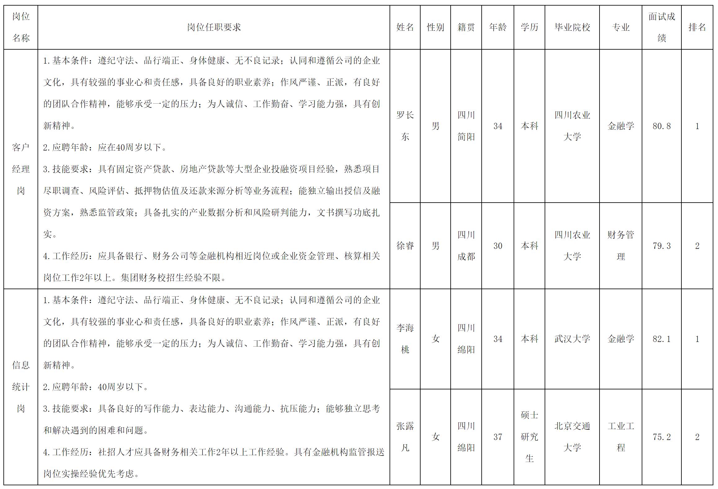 根據(jù)四川長虹集團(tuán)財(cái)務(wù)有限公司發(fā)布的招聘公告及招聘相關(guān)規(guī)定,經(jīng)面試程序后,現(xiàn)將面試成績予以公示。