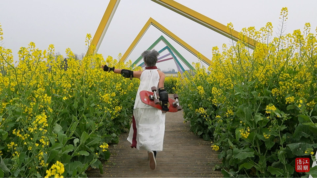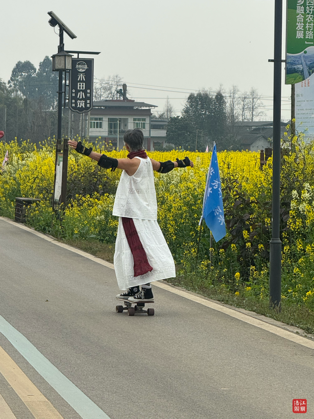 “誰(shuí)家奶奶還玩滑板呀?”路遇一群在油菜花田里春游的幼兒園小朋友,孩子們睜大眼睛好奇發(fā)問(wèn)。錢(qián)立群故意輕輕一蹬,滑板帶著裙擺滑出半米,逗得孩子們拍著手歡呼:“奶奶好厲害!”