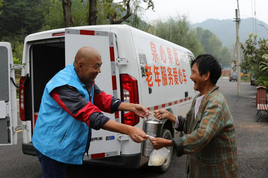 志愿者給北京市延慶區(qū)珍珠泉鄉(xiāng)的農(nóng)村老人送餐。新華社發(fā)
