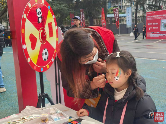 最熱鬧的當屬彩妝技能體驗區(qū)。來自游仙順風職業(yè)培訓學校的專業(yè)老師剛擺好工具,轉盤前就排起了長隊。足球、熊貓、國旗、愛心,四種樣式的彩繪圖案隨著轉盤旋轉,為球迷們帶來一份份驚喜。5歲的康卓翊小朋友在家人的陪伴下,轉動轉盤選中了“國旗”圖案。當老師將鮮艷的國旗彩繪貼在他的小臉上時,他笑得格外開心。“我們一家人都來看球,支持綿陽隊!”康卓翊說。