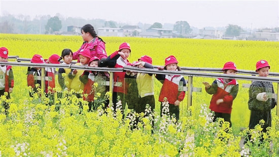 油菜花田里,孩子們感受春日美好。