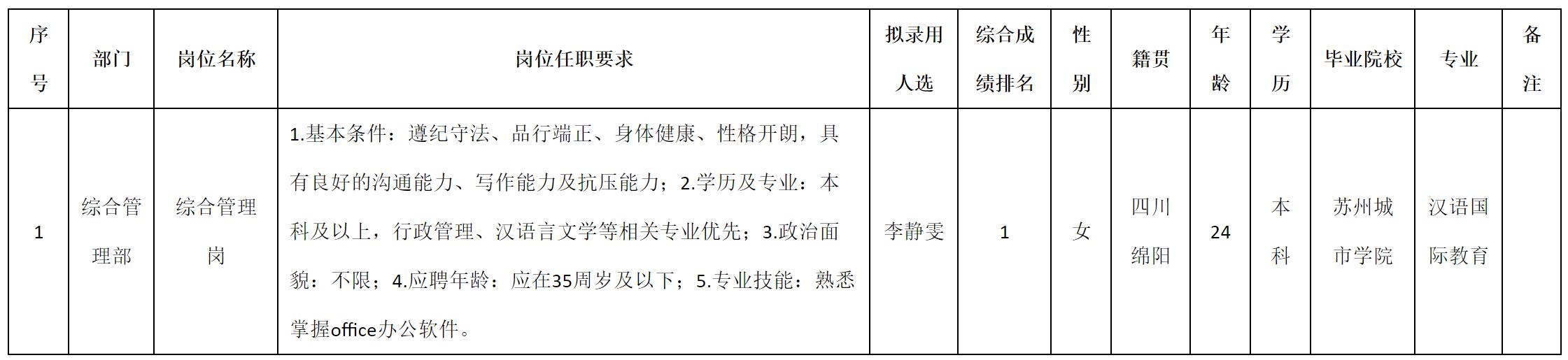 根據(jù)四川九洲防控科技有限責任公司發(fā)布的招聘公告及招聘相關(guān)規(guī)定,經(jīng)測試、考察、體檢等程序,擬錄用李靜雯同志到四川九洲防控科技有限責任公司工作,現(xiàn)予以公示,具體情況如下: