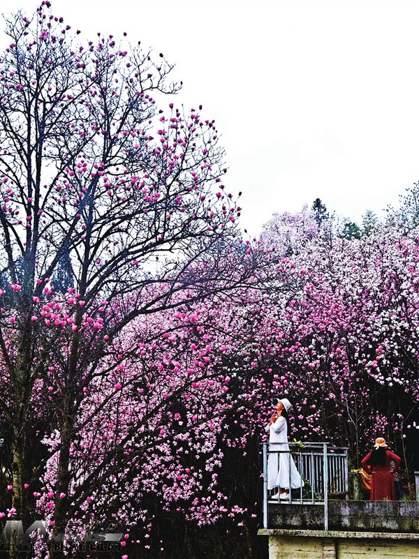 江油戴天山辛夷花盛開,游客在花樹下欣賞美景。 記者 陳元松 攝