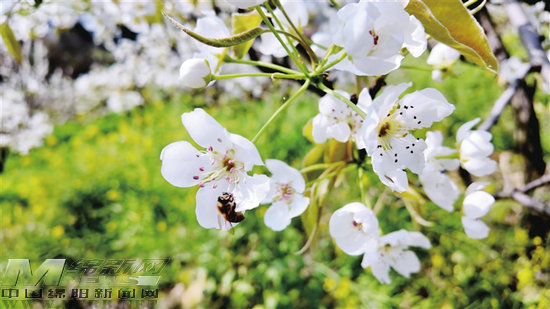 梨花盛放,蜜蜂在花間忙碌采擷春日芬芳。記者 尹秦 攝