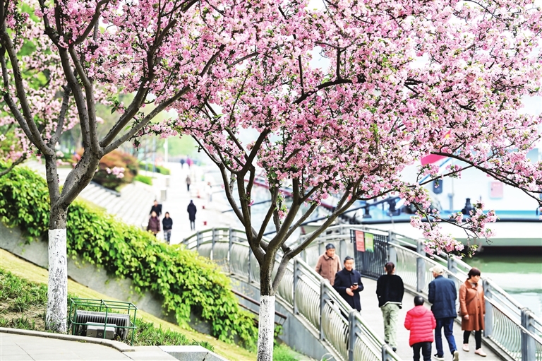 陽光穿透江畔的薄霧,溫柔的春風(fēng)裹挾著櫻花特有的清甜,在江邊步道彌漫開來。市民游客紛紛駐足,或悠閑賞景,或在樹下定格最美瞬間,愜意地感受著春天的盎然生機(jī)。
