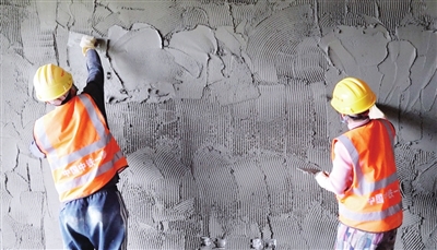 工人正在進行墻面抹灰作業(yè)。記者 王澤宇 攝