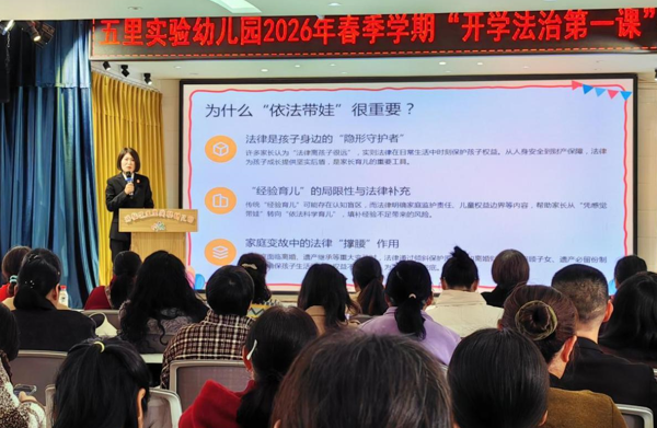 綿陽(yáng)新聞網(wǎng)訊 為了深入推進(jìn)依法治園,強(qiáng)化家園共育合力,筑牢未成年人保護(hù)防線,五里實(shí)驗(yàn)幼兒園于 3 月 20 日下午,游仙區(qū)五里實(shí)驗(yàn)幼兒園開(kāi)展了以“法治護(hù)航 家園共育”為主題的 2026 年春季學(xué)期“開(kāi)學(xué)第一堂法治課”活動(dòng)。本次活動(dòng)特邀該園法治副校長(zhǎng),游仙區(qū)人民法院綜合審判庭庭長(zhǎng),一級(jí)法官陽(yáng)力擔(dān)任主講嘉賓,吸引了 80 名自愿報(bào)名的家長(zhǎng)積極參與。