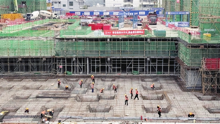 施工現(xiàn)場,9棟高層住宅已拔地而起,10余臺(tái)大型設(shè)備正開足馬力運(yùn)轉(zhuǎn)。高峰期時(shí),近500名工人同時(shí)作業(yè),鋼筋工、木工、架子工分工明確,綁扎鋼筋、搭建模板、澆筑混凝土……每一道工序都緊鑼密鼓、有條不紊。