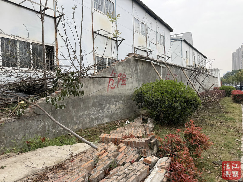金家林原光通信產(chǎn)業(yè)園有一段圍墻發(fā)生了倒塌,剩余部分墻體也已傾斜,緊鄰人行道卻無任何防護(hù),存在安全隱患。 [