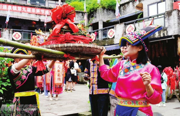6月8日,北川石椅羌寨鄉(xiāng)村振興先行區(qū)通泉鎮(zhèn)神木羌寨熱鬧非凡,來自各地的游客一起動手,包制寓意國泰民安、五谷豐登、民族大團結的56斤“粽子王”。 [